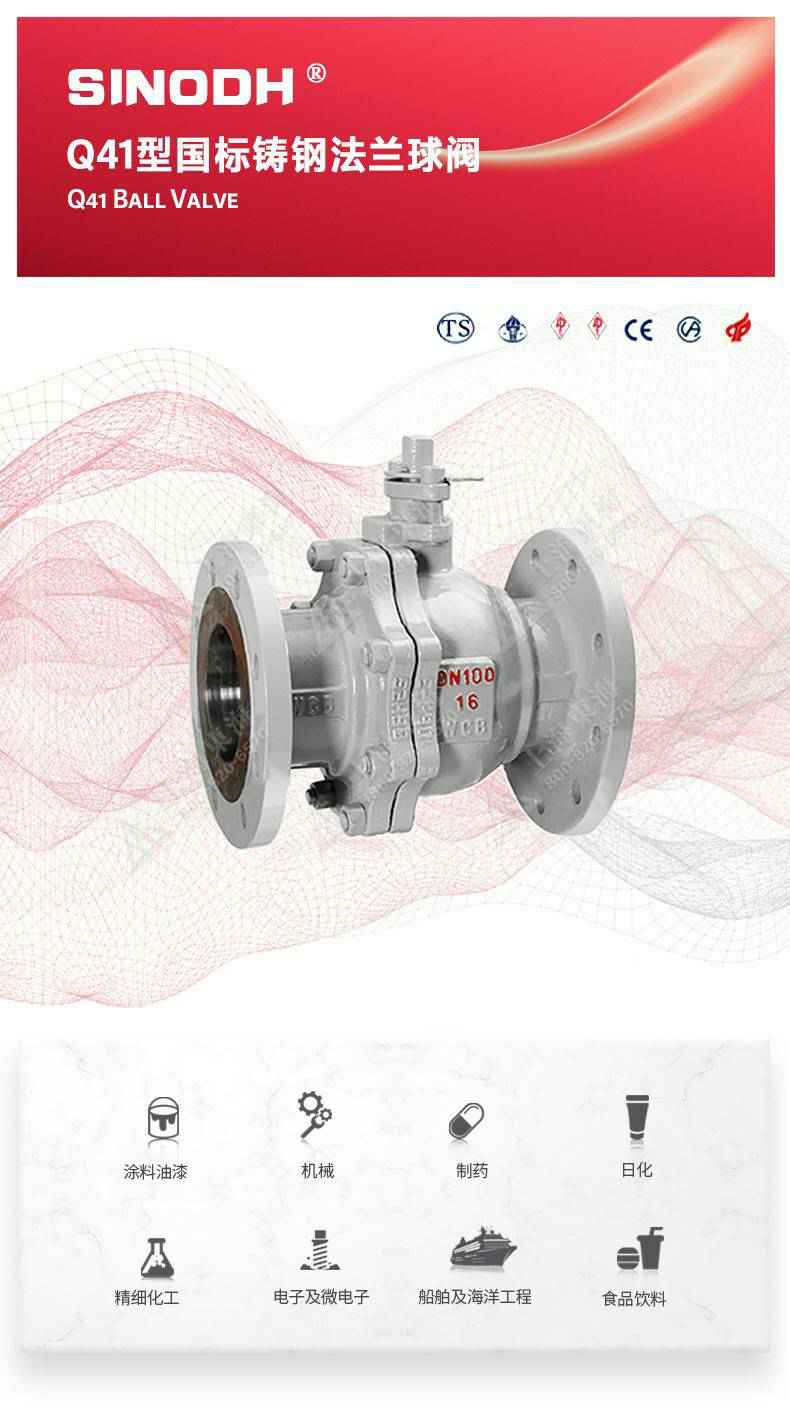 Q41型国标铸钢法兰球阀,为九游平台网页版登录入口-九游(中国)自主研发生产。本产品设计制造标准符合GB/T12237、GB/T12224标准。该产品的球体在介质压力作用下球体能产生一定的位移并紧压在出口端的密封面上,保证出口端密封。适用于水、溶剂、酸和天然气等一般工业介质也适用于工况恶劣的介质,如氧气、过氧化氢、甲烷和乙烯等介质。